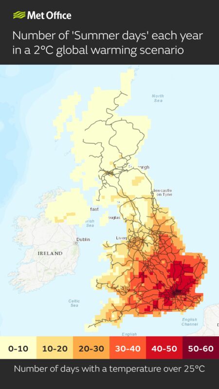 - Days above 25°C can indicate when trains could be disrupted due to overheating of railway infrastructure