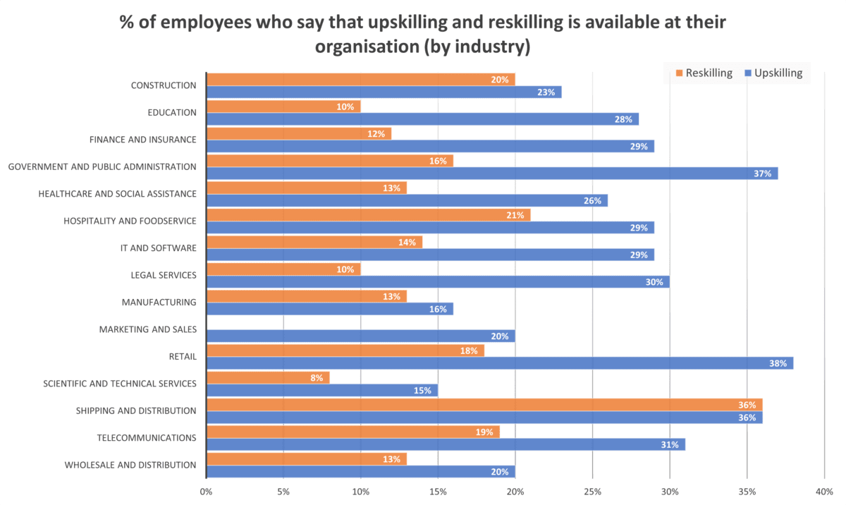 People working in retail, government and public administration, and shipping and distribution are, statistically, the most likely to have access to upskilling training (offered to 38%, 37% and 36% of employees in those industries respectively). While workers in hospitality and food services, and construction, are the most likely to have access to reskilling training (21% and 20% respectively).