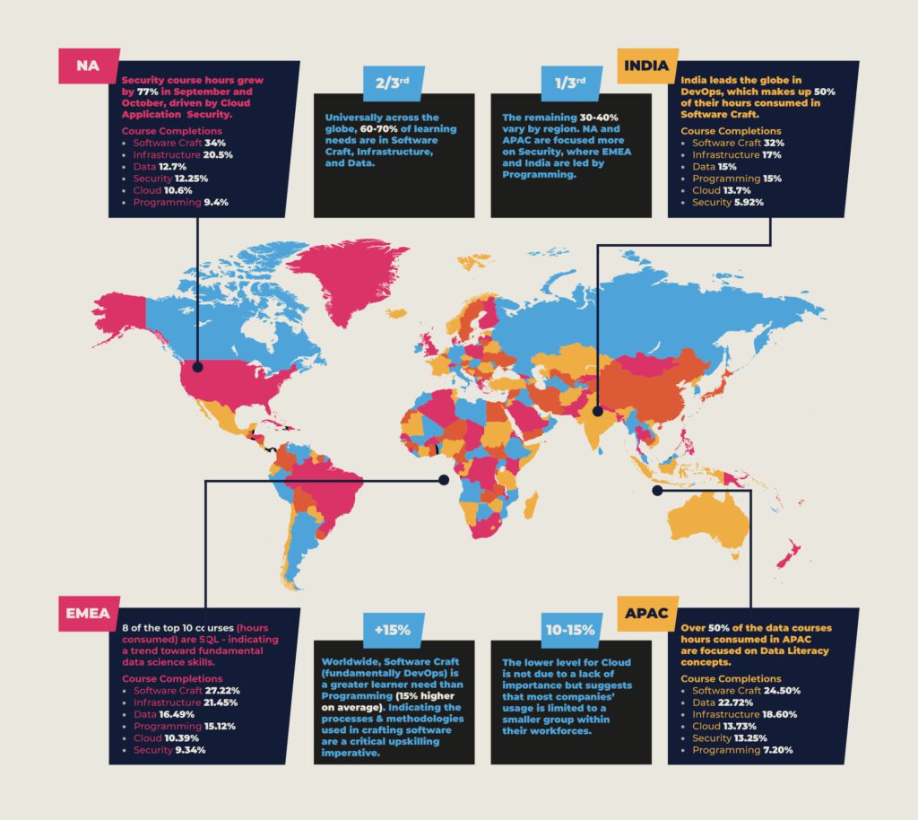 The report captures the collective technology learning needs of five million learners from the technology and developer industry. Using consumption and search patterns from these users across five areas – Software Craft, Programming, Data, Security, and Cloud – the report highlights resulting trends and recommends corresponding skills to develop.