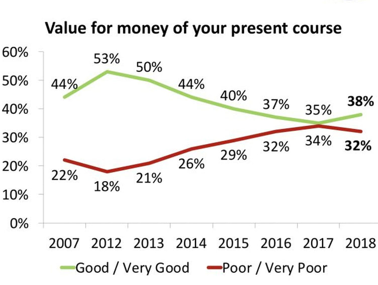Back in 2017, Nick Hillman predicted that the proportion of full-time undergraduates who think they are getting ‘poor’ or ‘very poor’ value for money was about to overtake the proportion who think they are getting ‘good’ or ‘very good’ value for money.