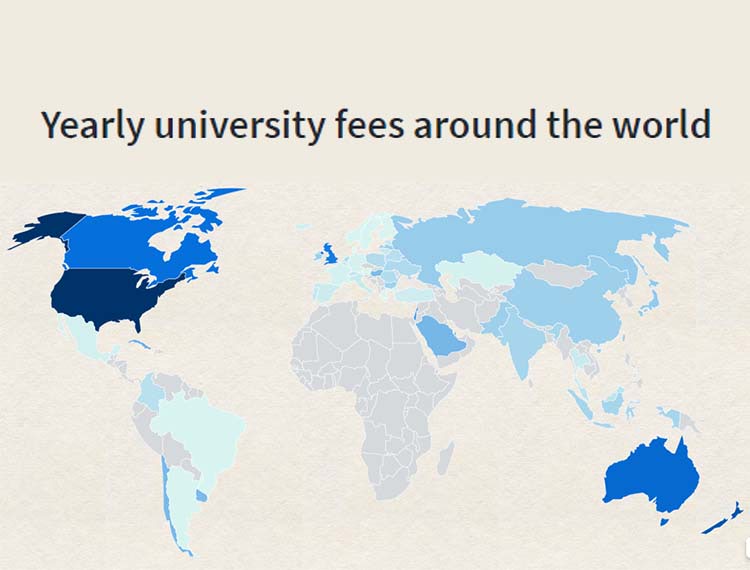 The minimum cost of a year’s tuition at a public university around the world is £2,536 on average, with most European countries charging under £1,000 per year for UK students.