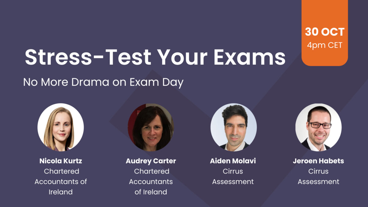 Nicola Kurtz and Audrey Carter (Chartered Accountants Ireland), Aiden Molavi (Cirrus Service Desk) and Jeroen Habets (Cirrus CTO) will each share battle-tested practices from their work managing high-stakes exams.