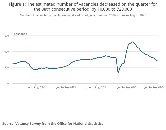 - The estimated number of vacancies in the UK fell by 10,000 (1.4%) on the quarter, to 728,000, in June to August 2025. This is the 38th consecutive period where vacancy numbers have dropped compared with the previous three months, with vacancies decreasing in 9 of the 18 industry sectors.