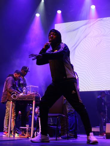 14-16 year old students performing their own music and raps on stage at The Broadway Theatre as part of the nationwide Barbican Box project.