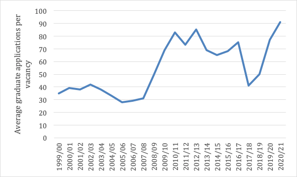 They received an average of 91 applications per graduate vacancy, which is a 17% increase on last year and the highest number since the ISE began collecting data in 1991.