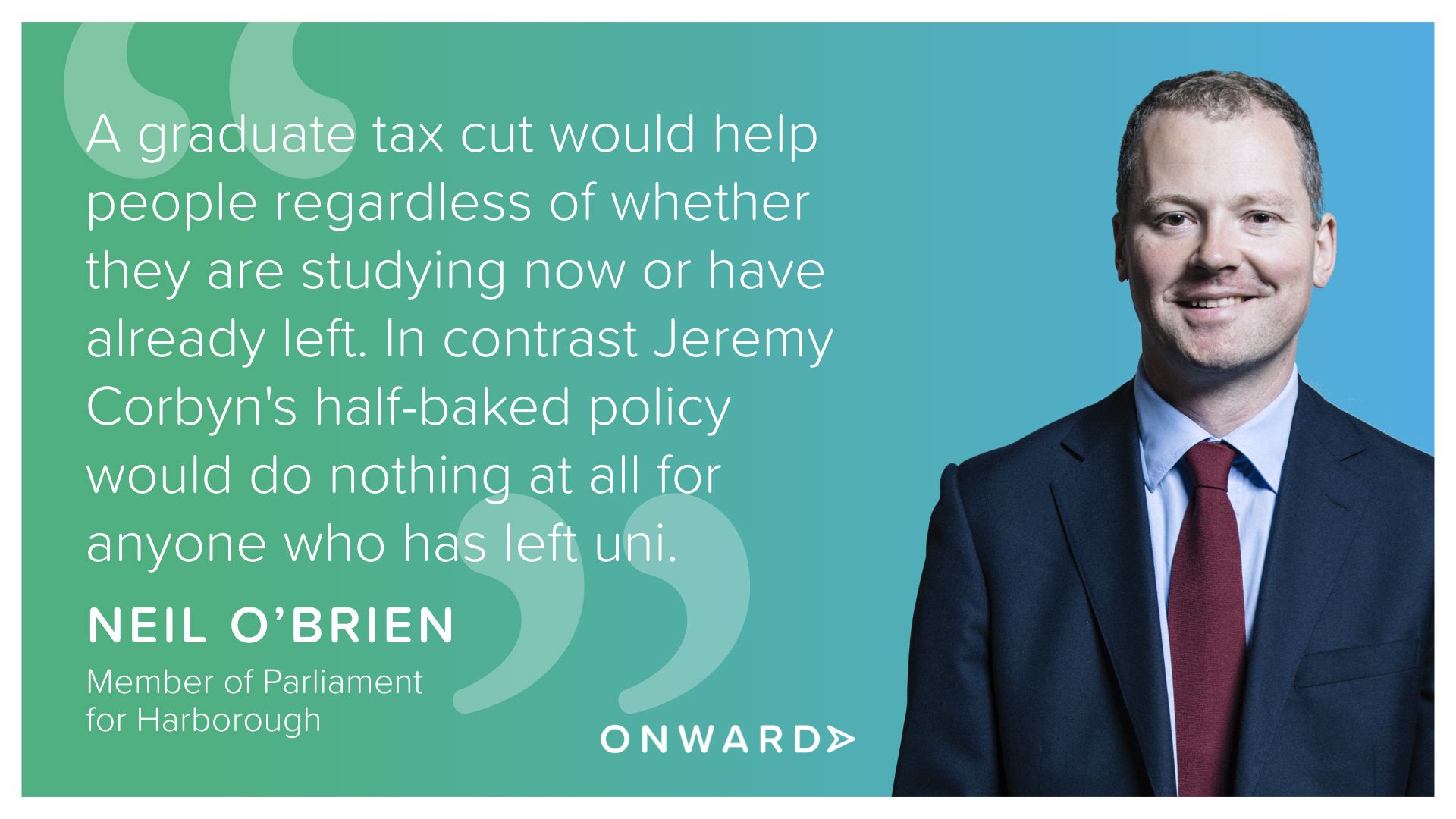 - Introduce a graduate tax cut of 50p in every pound to halve the loan repayments of 2 million graduates. This has the advantage over reducing fees or changing future repayment terms as it would apply to anyone repaying their loan, past, present or future, while putting cash back in the pockets of young people.