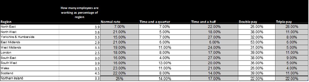 The North East of England is the most likely to get paid triple time with 28% of employees receiving this wage for working on Christmas Day. Northern Ireland workers are the most likely to be paid the normal rate. A full breakdown of pay per region can be seen below:
