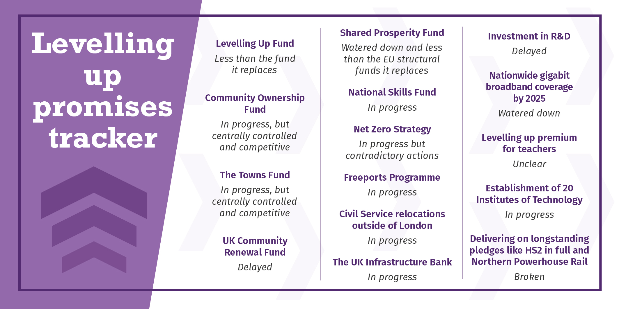 IPPR North’s research also includes a new ‘levelling up promises tracker’, which examines government’s progress on promises made relating to its levelling up agenda and finds that many have been broken, scaled back or represent a reduction to other pots of funding they replace.