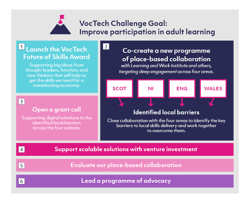 - A series of place-based projects across the four nations of the UK where we can take a whole system approach to tackling adult participation in learning, building on the existing evidence base for adult participation and working closely with local partners to identify systemic barriers and support the development of targeted potential solutions